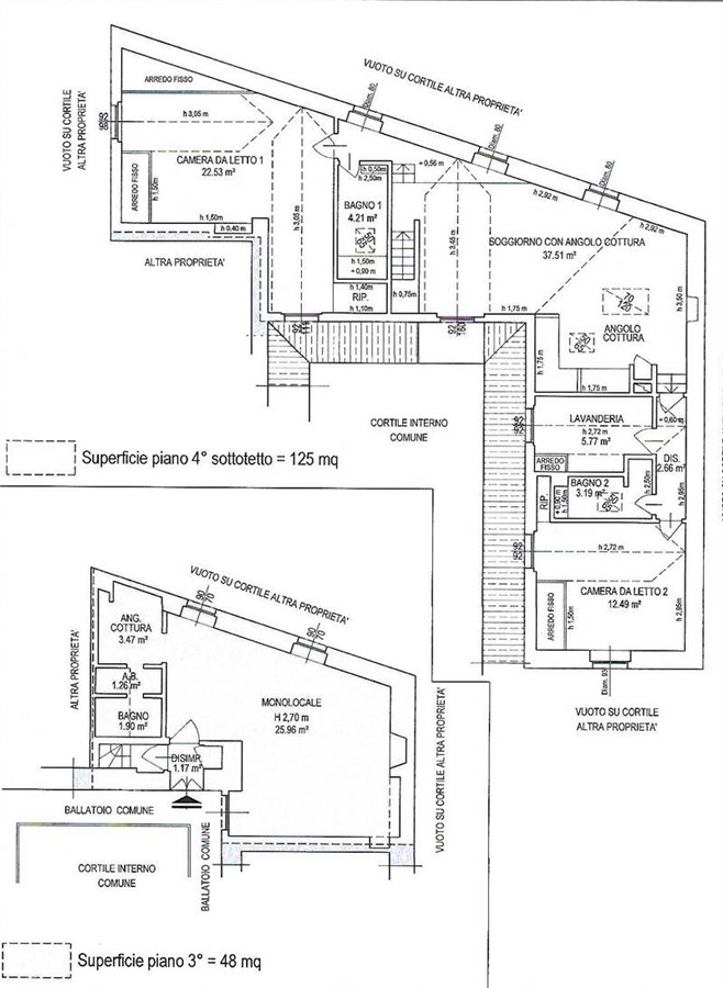 •    4° e ultimo piano: appartamento di circa 130mq composto da soggiorno con cucina a vista, 2 camere da letto, 2 bagni e una piccola stanza adibita a studio