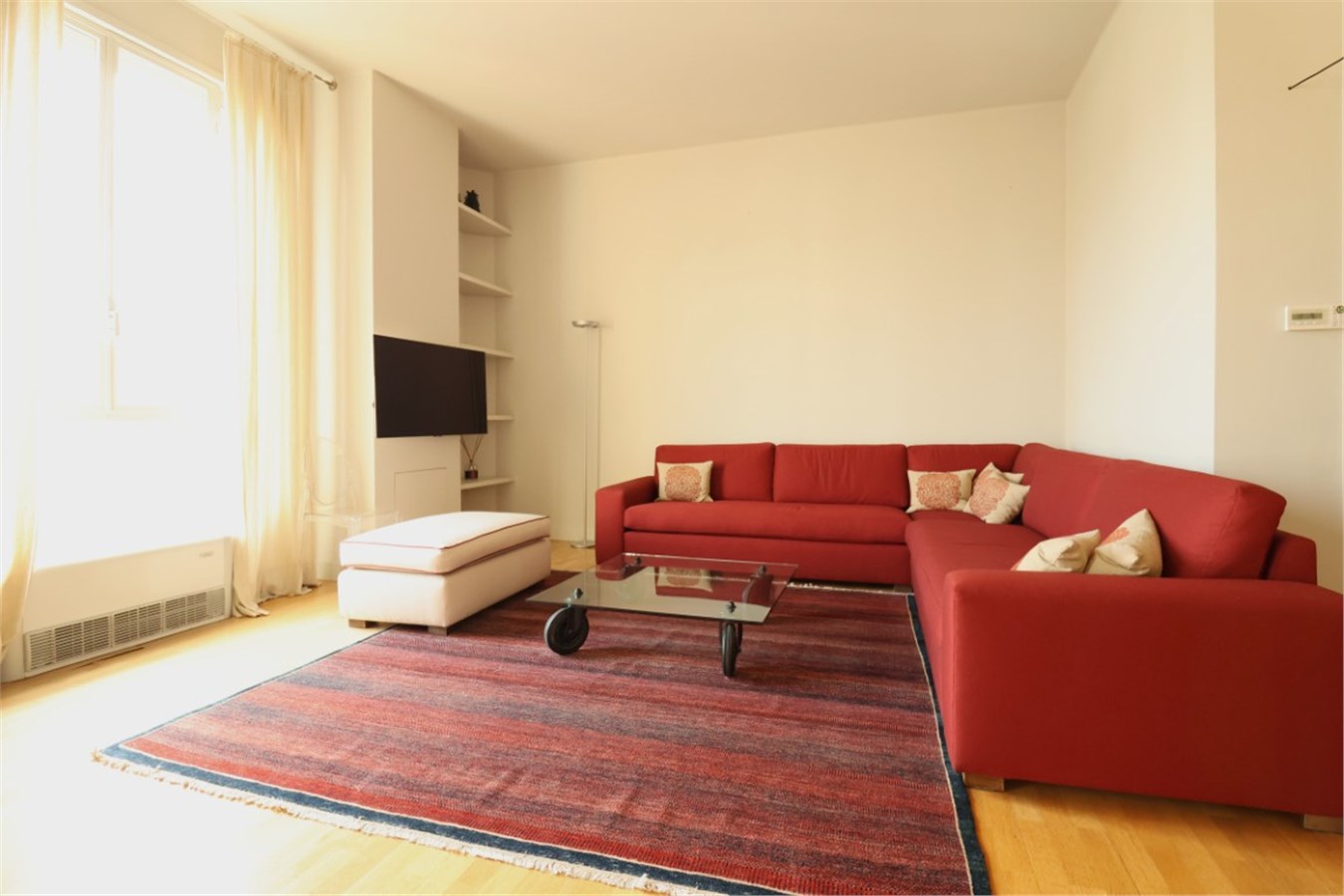 The apartment is characterized by generous proportions, high ceilings, and a large double-glazed window, creating a bright and welcoming living space.