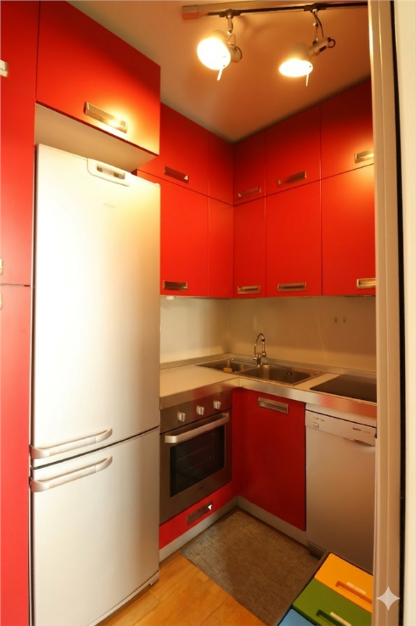 High-quality parquet flooring runs throughout the apartment, enhancing the elegant atmosphere, while a reinforced security door provides additional safety.